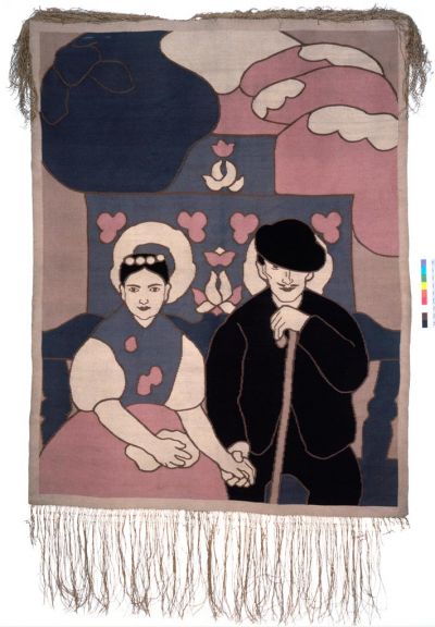 A kárpitok a falusi élet egy-egy jelenetét ábrázolják. Az elsőn mint egy régi fotográfián jelenik meg a jegyespár. Merev beállításban, megilletődötten ülnek, arcuknak csak fő vonásai látszanak, ünnepi öltözékük csak egy-egy színes folt, s a háttér díszes függönyén is elmosódottak a virágok. Az egykori gyermekek s felnőttek életének nagy eseményét, a vásárt örökíti meg a másik kárpit. A sokadalom kiragadott részlete, kissé felülről nézve, mint egy emlékkép jelenik meg a kárpiton. A művész csak színekre, formákra, vonalakra emlékezik, az emberek arctalanok. A menyecskék, parasztasszonyok, pásztorok nem törődnek a szemlélővel, a többségük hátat fordít nekünk, s az egyetlen szembenálló asszony is lehajtja fejét. A kárpiton nincs horizont, így nem nyerhetünk kitekintést a vásár egészére. A kárpit szegélye belevág az asszonyok ruhájába, alakjába, ezzel is hangsúlyozva a jelenet esetlegességét. A Vaszary-kárpitok közül a Vásáron érezhető leginkább a francia Émile Bernard hatása (Breton asszonyok a vásárban, Breton nők körtét szednek, 1888). Művei cselekvést ábrázolnak, de megmerevedett cselekvést, nincs köztük szerkesztett tér, a figurákat és a tárgyakat egymás mellé helyezett színfoltokból alakítja ki a művész. Vaszary ezeket az alapelveket figyelembe véve teremti meg egyéni, jellegzetes stílusát. A Jegyespár vidámabb - lilásrózsaszín, fehér, sötétkék, szürke, halványkék - a Vásár komorabb - lilásrózsaszín, kékesszürke, feketéskék, fehér- színvilága, a lendületes, vastag kontúrok, a már említett kompozíciós elvekkel együtt a kárpitokat a magyar szecesszió kiemelkedő alkotásaivá avatják. A kárpitok négy bazsarózsás függönyszárnnyal és hat bazsarózsás karosszékkel együtt az 1905. évi velencei kiállítás - Bálint Zoltán és Jámbor Lajos tetvezte - magyar termébe készültek. Kovalszky Sarolta és Radisics Jenő (az Iparművészeti Múzeum akkori igazgatója) levelezéséből tudjuk, hogy a kárpitokat és a függönyöket Németeleméren, a karosszékek huzatát a szomszédos Nagybecskereken szőtték meg két hónap alatt (IM Adattár 69, 145/ 1905). A Vásár egy változatát a gödöllői műhely is elkészítette 1907-ben (Magyar Iparművészet 10. évf. 1907, 142.).