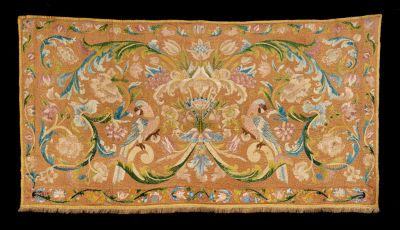 Anyag: | aranyszínű fémfonal; sodratlan selyemfonal; vászon alap |