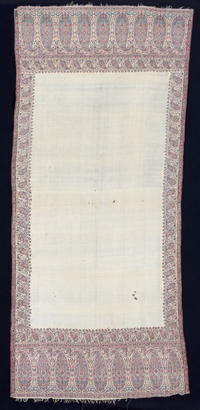 Alapja csontszínű. Körben bordűrrel kereteit. Keskenyebb sávjában hullámzó szárra fűzött zöld leveles vörös szegfűk. A szélesebb sávban laza elrendezésű zöld és kék leveles ágak, vörös virágok, a benne kirajzolódó mir-i-bota-forma a sűrűbb mintázatból alakul ki. A sál két végén hasonló megoldással nagy léptékű mir-i-boták sora.