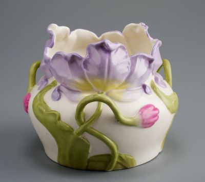 A lapított gömb alakú, csontszínű testre, az egyenes talptól felfelé indázva, háromszor két-két leveles virágszál borul. Három, lila és sárga színű kinyílt nőszirom virágfej alkotja a váza öblös nyakát, hullámzó szegélyű száját. A három oldalra hajló rózsaszínű bimbó szára kihajlik a vázatest felületéről, három fület képezve. A máz alatti festés pasztellszínű, a levelek zöldje matt. A Fischer gyár Horti Pál fémből kalapált azonos vázáját sokszorosította, feltehetően a színezést is a művész tervezte.