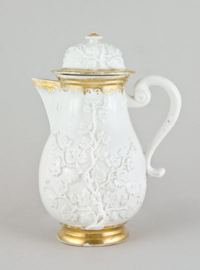 Kerek, tagolt, ívelt, aranyozott talpán körte alakú test, hegyes kiöntővel, tagolt kérdőjel alakú füllel. Két oldalán egy-egy plasztikus szőlőtő fürtökkel, szája körül és kiöntőjén aranyozott díszítménysáv fut körbe. Betétkarimás, boltozatos fedele arany peremű, plasztikus szőlőággal, kis kúpos, aranyozott fogógombbal. Technikája alapján ez is "Böttger-edény", miként a vele azonos módon díszített kávéscsésze és alja (IM ltsz.: 5873.a-b.).