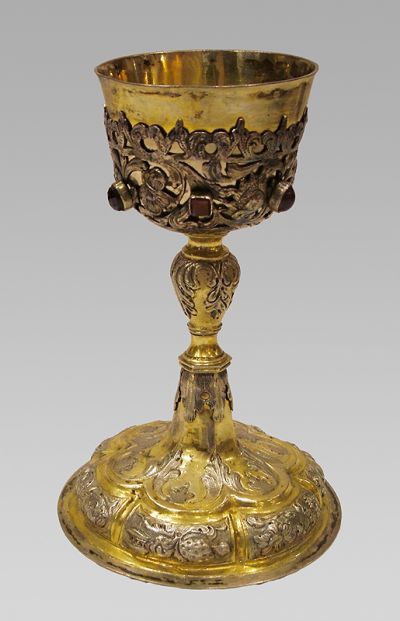 A vízsszintesen két részre osztott hatkaréjos talpat az alsó sávban téglány alakú mezőkbe foglalt, trébelt, aranyozás nélkül hagyott virág- és gyümölcsmotívumok díszítik, felső felületét pedig a szár felé forduló, sugarasan álló levélinda-ornamentika tagolja. A hatszögletű, enyhén elkeskenyedő szár felső részére ezüst levélgallér illeszkedik, a vázaalakú nódusz levéldíszes. A kuppa kissé nyomott félgömb alakú, pereme harangszerűen kihajlik; magasságának háromnegyedéig áttört, színes üvegkövekkel díszített ezüstkosárban ül. Aranyozást csak a kuppa felső sávja kapott. Talpperemén a brassói Martinus (Merten) Tink mesterjegye látható („MT”, fölötte koronával, lásd Kőszeghy 178), aki 1586-ban és 1587-ben szerepel mesterként a forrásokban (Gyárfás Tihamér: A brassai ötvösség története. Művelődéstörténeti monográfiák, 2. Brassó, 1912, 95: 92. sz.; 323: 94. sz.).