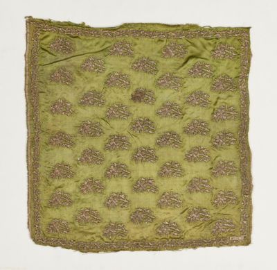 Anyag: | arany színű fémfonal; atlaszszövet; ezüst színű flitter |