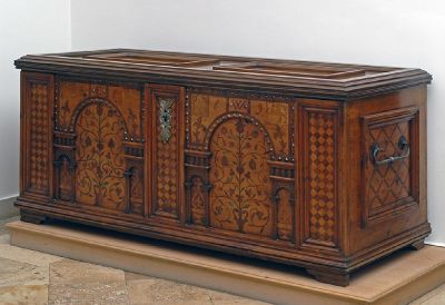 A késő reneszánsz kedvelt díszítménye, az "olaszkorsó" itt is megjelenik stilizált bimbós-virágos, szimmetrikusan hajló indáival. "A 17. századi magyar bútorok olaszkorsós dísze hasonló az e korban készült dél-német bútorok olaszkorsós, ún. Maikrug díszéhez. Ez a jellegzetesen magyarrá vált motívum a 17. századra jellemző dél-német igazodás előtt is élt Magyarországon, melynek következtében a dél-német hatáson túlmenően, bútorainkon e motívum párhuzamos fejlődésére és virágzására is kell gondolnunk." (Batári F.) A kelengyeláda intarziája - hasonlóan más ilyen jellegű munkákhoz - a színesség benyomását kelti. Ezekre azonban éppen az a jellemző, hogy csupán a zöld színt nyerték pácolással, a különböző fákból összeállított intarzia "színességét" a fafajták természetes színárnyalatai adják.