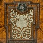 | Anyag: | diófa berakás; fenyőfa alap (vakfa); jávorfa berakás; kovácsoltvas veretek; mahagóni berakás; rózsafa (paliszander) berakás; tujagyökér berakás |