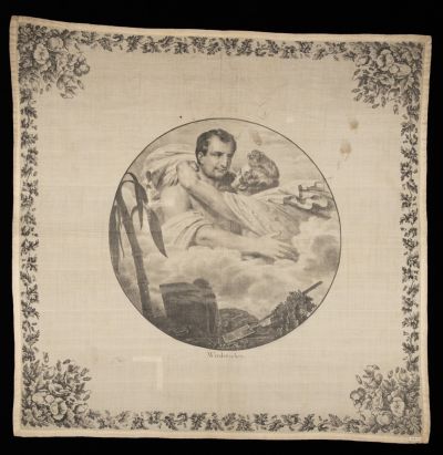 Franz Valier 1832-ben szerzett privilégiumot, hogy a Boden-tó közelében fekvő Mittelweiherburgban textilnyomó üzemet működtessen, pontosabban hogy litográfiai eljárással nyomott textíliákat készítsen (ld. itt). Ezzel az eljárással készült az itt bemutatott kendő is, amelyet azonban a Vorarlberger Landesarchivban őrzött dokumentum szerint - nyilván az ábrázolás kissé ironikus hangvétele miatt - 1833-ban betiltottak (ld. itt, Schachtel 330, Präsidiale: 1833-1834, XXI 1-115, Nr. 13.)
