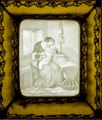 Anyag: | lithophan; litofán porcelán; selyemmel bevont drótkeretben |