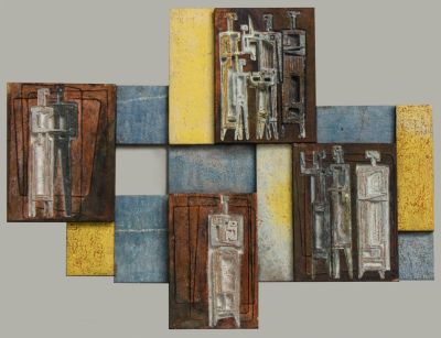 Technika: | elemekből összeállított; magastüzű színes mázakkal festett; mintázott elemekkel |