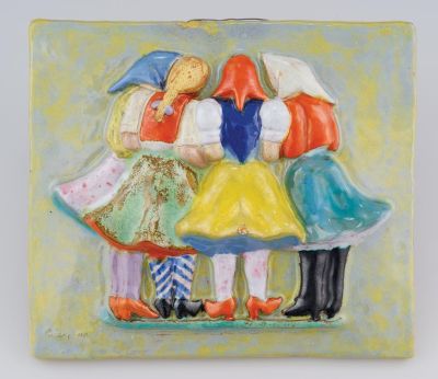 Kerámiakép - összekapaszkodó falusi asszonyokkal