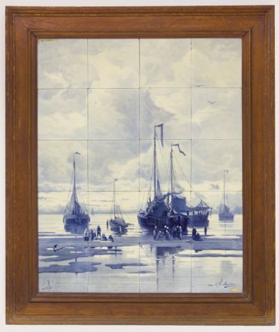 Jelzés: | j. l.: naar H. W. Mesdag; b. l.: a delfti Porselanflesk (Porcelánpalack) műhely jegye JN Delft aláírással |