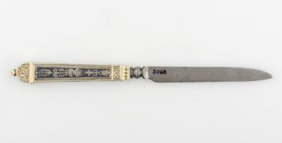 A kés pengéje, éle és foka felől egyformán elhegyesedő, a villa kétágú acélból. Lapos, négyhasábos nyelén reneszánsz ornamentika. Nyelének végén félköríves plasztikus díszítmény, apró gombbal. A kés és villa nyele azonos.
