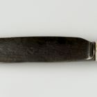 A kés pengéje acél, enyhén hajlított, rajta késműves jegy. Nyele fajansz, hatoldalú, felfelé keskenyedő, végén kis réz "csapolás". Díszítése: a nyél végén és a pengéhez csatlakozó homorú tagon ibolyaszínű márványozás. A nyélen kék színű lambrequin-motívum, vonalakkal keretelt, szélesebb elő- és hátlapján egy-egy rozetta. A hozzá tartozó 3061. leltári számú villa kétágú, tagolt, karéjban végződő. Nyelének díszítése azonos a késével.