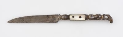 A kés pengéjének éle egyenes, foka hajlik előre a hegyéhez. Nyelének tövében gömbölyded tagolás fölött mindkét oldalán két-két szögeccsel erősített gyöngyház lemez. A nyél vége pilaszterszerűen kiképezve, rajta ülő oroszlán. Analógiáját közli Pabst, A.: Die Kunstsammlungen Richard Zschille. 1. köt. Berlin, 1893. Nr. 2. és 5., I. t.