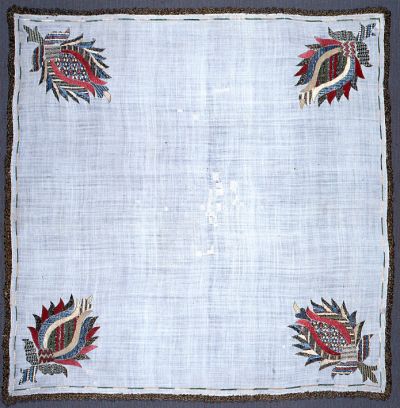 Technika: | kétoldalas, mintázott laposöltés; vert csipkeszegély |