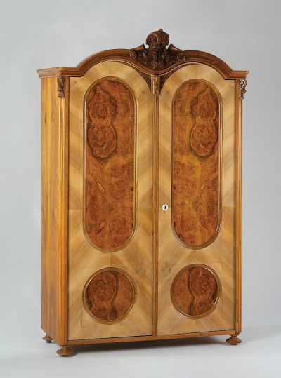 Négy, lapított, pogácsa alakú lábon áll. Álló hasáb formájú, kétajtós. Az ajtókon lent kerek, fent nyújtott, hosszovális, bemélyülő betétmező. Pilaszterei rózsás fejezetűek. ívelten tagolt zárópárkányának közepén faragott csigás, leveles, rózsás díszítmény. Az egyik szekrény baloldalán bévül, fent "KATHARINA STAMER", a másik szekrény hátfalán "KS", illetve tetején belül "KATHARINA STAMER" jelzés: az ajándékozó nagyanyjának beégetett neve.