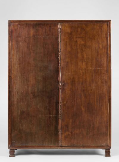 A teljesen egyszerű téglatest forma szinte minden díszt nélkülöz. A szekrény csupán a homlokoldalon kapott ívelt profilú keretlécet. Az ütközőlécen és a szekrények oldalán keskeny, faragott dísz fut végig, rajta hosszú, vékony, stilizált tulipán tűnik fel, mely Lajta a Vas Utcai Kereskedelmi Iskola számára tervezett bútorainak, illetve Kozma korai, 1913-ban bemutatott darabjainak díszítésével mutat közeli kapcsolatot. Az egyszerű forma és a szerény díszítés ellenére a bútordarab mégis eleganciát sugároz: a sötét, sík felületek kiemelik a fa szépségét.