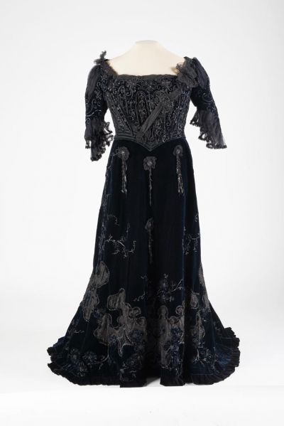 Dereka halcsonttal merevített, szélesen, ívelten dekoltált, a hátán kapcsokkal záródik. Derékvonala csúcsban lenyúlik. Ujja bevarrott, vállban buggyos, könyékig ér. A bársonyba körben és az ujján ék alakban tüll betétek nyúlnak be. A tüll fekete, körben fekete gyöngy- és flitter sorral kereteit, rajta flitterrel hímzett kék bársonylevél rátétek, flitterből és paiettből hímzett voluták és virágdíszek. Ujját húzott tüllfodor szegélyezi.