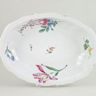A hozzá tartozó ovális, mély kézmosótál, keskeny és vízszintes, pereme hullámos szélű, oldala bordás. Öblében festett rózsás csokor, bíborral árnyalt sárga tulipán és elszórva kisebb virágok bíbor, zöld, sárga, kék és vasvörös színekben.