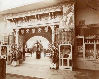 Kiállításfotó - a háziipari terem az 1906. évi Milánói Világkiállítás magyar pavilonjában a Nagy Sándor által festett kapuval