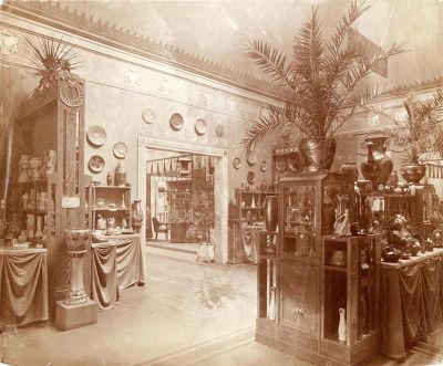 Kiállításfotó - a kerámiák terme a Zsolnay gyár termékeivel az 1906. évi Milánói Világkiállítás magyar pavilonjában