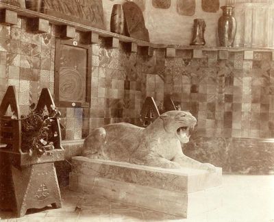 Kiállításfotó - az 1906. évi Milánói Világkiállítás magyar pavilonja a Kossuth Mauzóleum számára készült párduc szoborral
