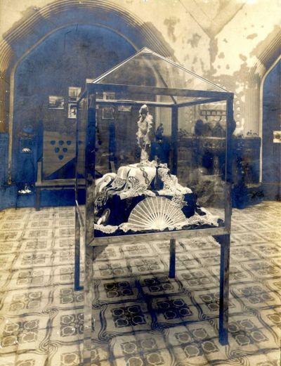 Kiállításfotó - csipkék és legyezők az 1906. évi Milánói Világkiállítás második magyar pavilonjának ún. galambos termében