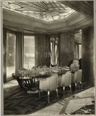 Kiállításfotó - ebédlő berendezés és terített asztal. Terv: Maurice Dufrene, Galeries Lafayette, Nemzetközi Iparművészeti Kiállítás, Párizs, 1925.