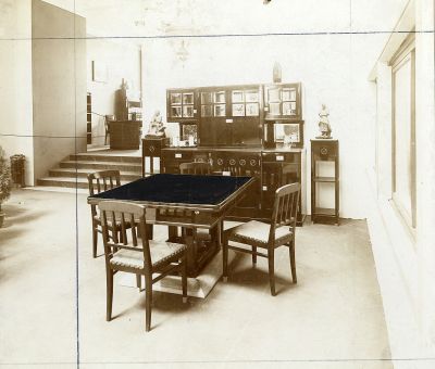 Kiállításfotó - ebédlőberendezés az Iparművészeti Társulat 1903. évi Karácsonyi Kiállításán, terv és kivitel Mocsay József