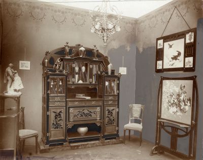 Kiállításfotó - Faragó Ödön tervezte szalonberendezés az Iparművészeti Társulat 1901-es karácsonyi kiállításán, kivitel: Bodoni Károly