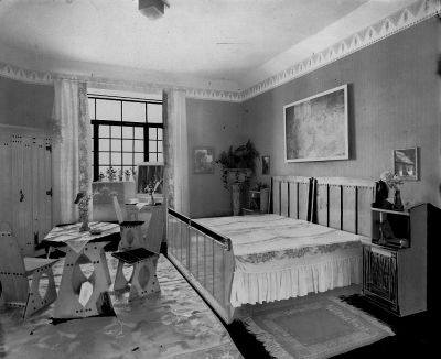 Kiállításfotó - hálószoba berendezése az Iparművészeti Társulat 1909. évi Tavaszi Kiállításán, kivitel Mérő Jenő
