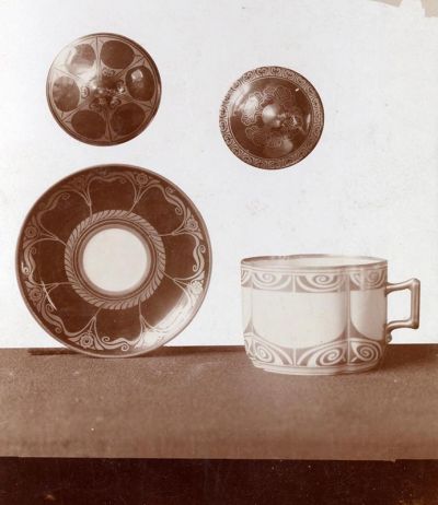 Kiállításfotó - Horti Pál tervezte porcelán kávéskészlet részei az Iparművészeti Társulat 1901. évi Karácsonyi Kiállításán