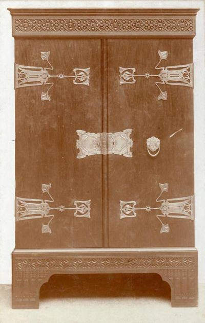 Kiállításfotó - műteremszekrény az Iparművészeti Társulat 1901-es karácsonyi kiállításán, tervező Horti Pál, kivitel: Melczer Nándor, Ludvig Ede