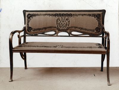 Kiállításfotó - pamlag égetett bársony kárpittal az Iparművészeti Társulat 1901-es karácsonyi kiállításán, kárpit tervező Mirkovszkyné Greguss Gizella