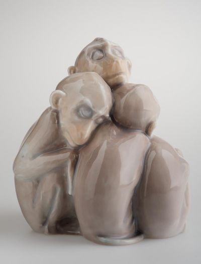 Összebújó, alvó csimpánzok. Az ülő anyamajom testéhez három kicsinye simul-kuporodik. A természethűen mintázott szoborcsoport szürkésbarna, lila és halvány narancsszínekkel festett.