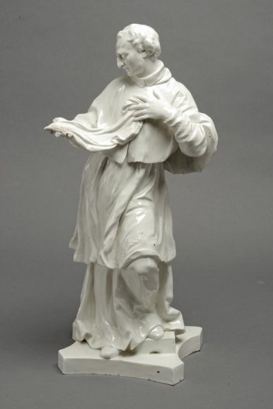 A Szent János evangélistát ábrázoló porcelánplasztika Camillo Rusconi szobra nyomán készült, míg párdarabja ( IM ltsz. 19440) az albát viselő, tonzúrás, kezében stólát tartó figura képében Borromei Szent Károlyt ábrázolja.