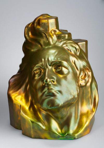 Hatoldalú hasábokból összeálló oszlopköteg alkotja a szobor hátoldalát. Ebből bontakozik ki elölnézetben az erőteljesen mintázott fiatal, szakállas férfifej. Az oldalra fordított, felfelé tekintő arc kifejezése elszánt és szenvedélyes. Lobogó hajtincse felcsap a legmagasabb oszlopra, a hajzat többi része oválisban kereteli a fejet, nyakat, összeolvadva a befogadó geometrikus formákkal. Talán az építészet, vagy még általánosabban az anyagból kibontakozó alkotó erő géniuszát ábrázolja az allegorikus szobor. Magángyűjteményből ismert a modell eredeti, Apáti Abt Sándor által kézzel mintázott, kiégetett agyagvázlata, amelyen az erőteljes, széles állkapocs, a finom arcszőrzet, a haj részletei nem tűnnek el a mázréteg alatt. Lásd: Csenkey-Steinert 2002, 135., 264., No. 116. A redukáló hatású égetés miatt varázslatosan árnyalatgazdag zöld-arany-lila-bronzos mázbevonat viszont fokozza a kompozíció hatáselemeit. Rajzát a Zsolnay gyári 8. Façonkönyvben találhatjuk, az 5638. szám alatt, „Abt Sándor mintája” bejegyzéssel. Abt összesen négy allegorikus büsztöt mintázott az 1899-1900. években. A Hold (La Luna) volt az első (5494 fazonszám), ezt követi a Géniusz, majd a Rózsaillat (Rózsaálom címen, 6064 fazonszám), végül a zenét megtestesítő nőalak (6130 fazonszám). Feltehetően mindössze néhány példány készült e kompozíciókból. Abt műveinek jegyzékében közli Mendöl 1977, 321.