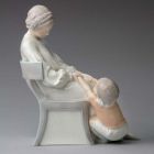 Máz alatt festett porcelán. Az anya ívelt lábakon álló székének háttámlája hajlított, a testet körülölelő. Az ülő testhelyzetben megörökített nőalak lágyan hátradől székében, két keze guggoló kisfiának ökölbe zárt kezeire fonódik, miközben egymás arcán nyugtatják tekintetüket. A kisplasztika zsánerszerű jelenetben örökíti meg anya és gyermekének kapcsolatát, melynek meghittségét sugallják az egymásba fonódó karok, tekintetek és a pasztell árnyalatokat felvonultató visszafogott kolorit.
