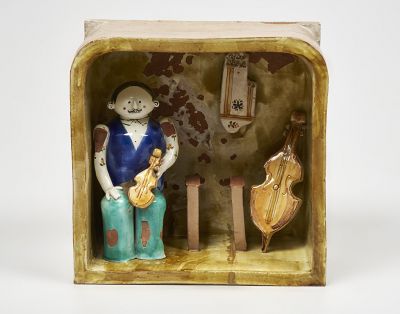 Kisplasztika - Hangszerész műhely, a Mesterségek című térplasztika eleme