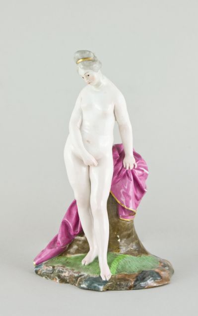 Füves talajt utánzó Ovális talapzaton lilás-rózsaszín lepellel borított fatörzs előtt, arra baljával támaszkodó, bal lábbal előre lépő, arany diadémos, ruhátlan nőalak.