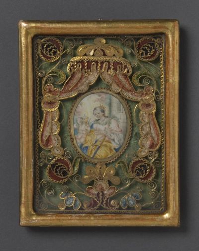 A pergamenkép körül aranyozott papírból és színes zseníliából kialakított díszítmények: a kép fölött vörös baldachin, körben az úrihímzések motívumaira emlékeztető gránátalmás és stilizált virágminták, valamint aranyozott papír-roulé díszítés.