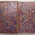 | Technika: | bőrkötés; bőrrátét; fém kapoccsal zárul; klisével aranyozott; papírmárványozás; színesen festett metszés |