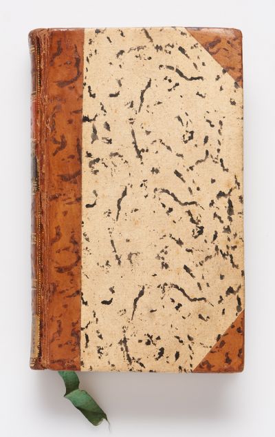 Technika: | befűrészelt, sima gerinc; dúcnyomás (papír); félbőr kötés; márványozott festés (bőr) |