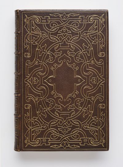 A jelzetlen kötés a 16. századi francia szalagfonatos díszű könyvkötések modorában készült.