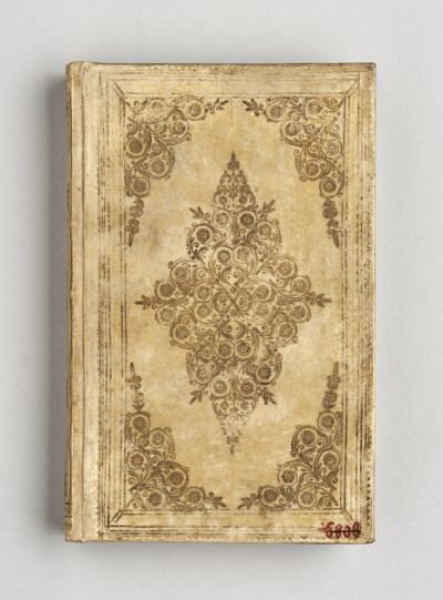 Aranyozott díszű pergamenkötésben, márványozott előzékkel, aranyozott, poncolt metszéssel.