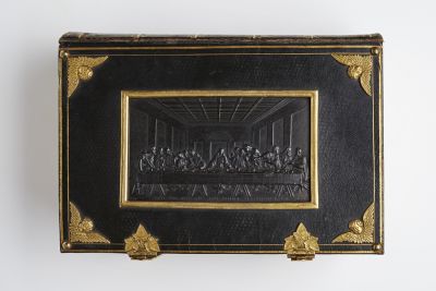 Könyv, kötéstábláján az Utolsó vacsorát, ill. Szűz Máriát ábrázoló öntöttvas plakettekkel - Biblia. Berlin, 1824