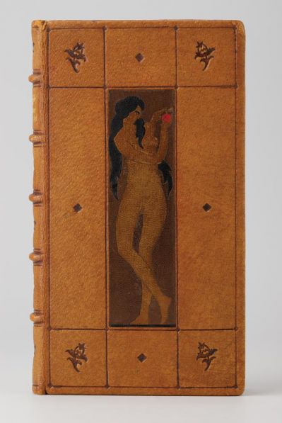 A világosbarna bőrkötés előtáblájának középső mezőjében sötét háttér előtt Éva álló alakja látható. Az almát, az eredendő bűn szimbólumát jobb kezében tartva felmutatja. A díszítés színes bőrberakással készült. A négyzet alakú sarokmezőkben vaknyomású gránátalmaminta, a köztük lévő, téglalap alakú mezők közepén 1-1 vaknyomású rombusz. A hátsó tábla vaknyomású léniával keretelt. Gerince öt bordával hat mezőre osztott, a másodikban aranyozott címfelirat, a többiben vaknyomású gránátalmaminta. Az előzék szürkésbarna papír. Metszése fejnél aranyozott.
