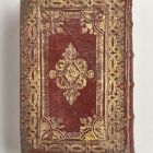 A vörösesbarna bőrkötés elő- és hátlapjának aranyozott díszítése megegyezik, de az első tábla közepén IHS, a hátsó táblán pedig Mária-monogram látható.