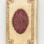 Papír táblákon fehér pergamenborítás. A kettős pontozott vonalú, ill. lénia keretelésű táblatükröt palmettasor veszi körül, sarkokban egy-egy ovális rozetta. A táblatükör közepén álló ovális vörösbőr rátét vaknyomású levélmintával leszorítva, benne IHS monogram, a hátsó táblán azonos díszítés: ovális bőrrátétben Mária monogram. Gerince fent és lent vaknyomással keretelt, madarakkal, kagylódíszekkel, rozettával díszített. Előzéke sárga alapú fehér és fekete virágmintás papír, metszése aranyozott, oromszegése fehér pergamenből készült.