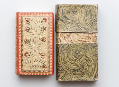 Technika: | aranyozott, poncolt metszés; bőrkötés; keményítős festés (papír); kézi színezés (bőr); lemeznyomás |