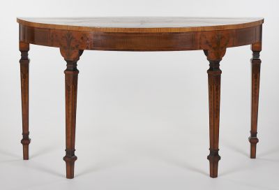 Négy, lefelé keskenyedő, alul kocka alakú, fent homorúan kiképzett, rakott díszítésű lábon áll. A félköríves lap középpontjában elhelyezkedő legyeződísz levélfüzéres keretéből az asztallap pereméig érő, nagy, kettős, csigás levelek nőnek ki, amelyek a lapot négy mezőre tagolják.